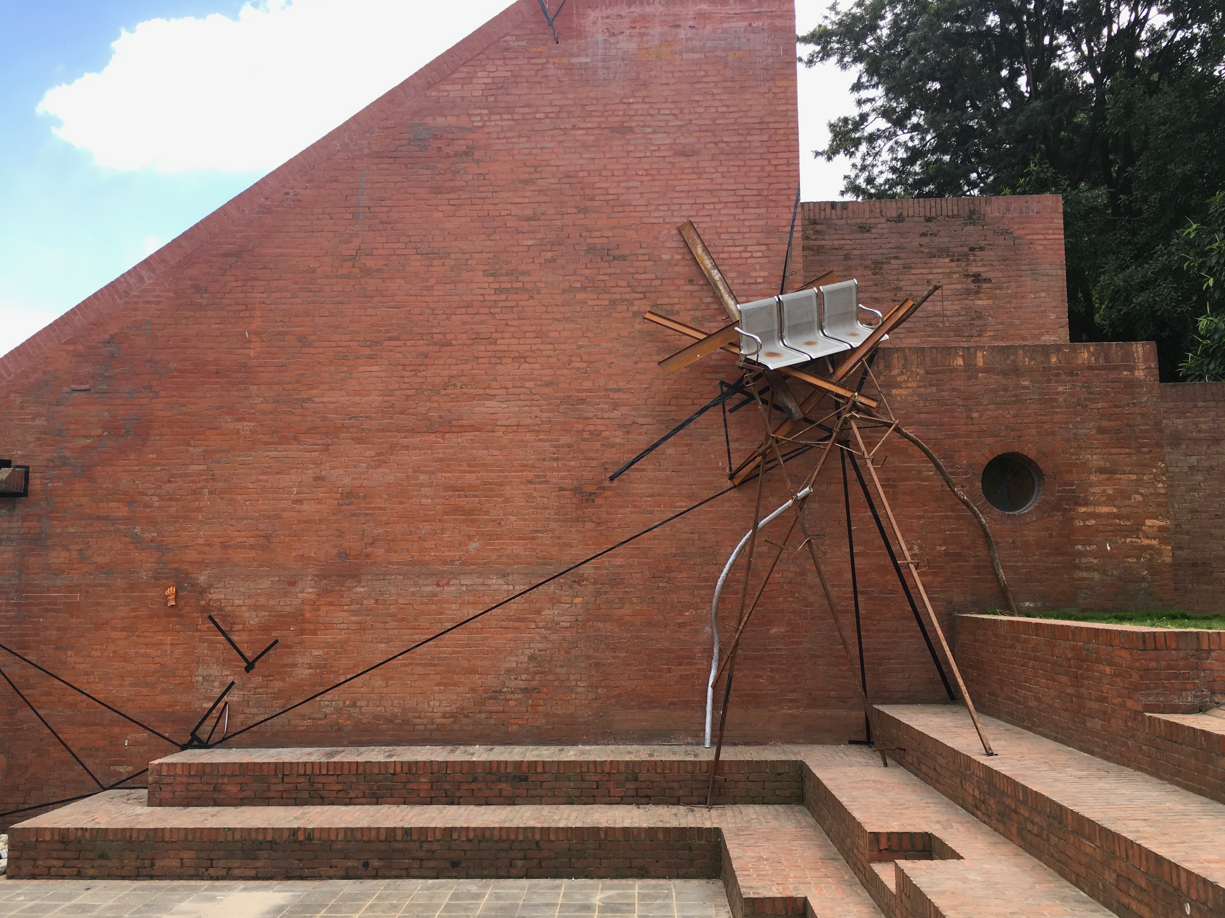 On the exterior wall of the museum, Emran Sohel's art piece leans awkwardly against the red brick for support. A three-seater bench is upthrust with long metal bars, as though balanced upon metal jackstraws. While a piece of a long black tape leads visitors to the room inside, where other exhibits are as overwhelming as this piece itself—what they reveal is obscure and stomach twisting.