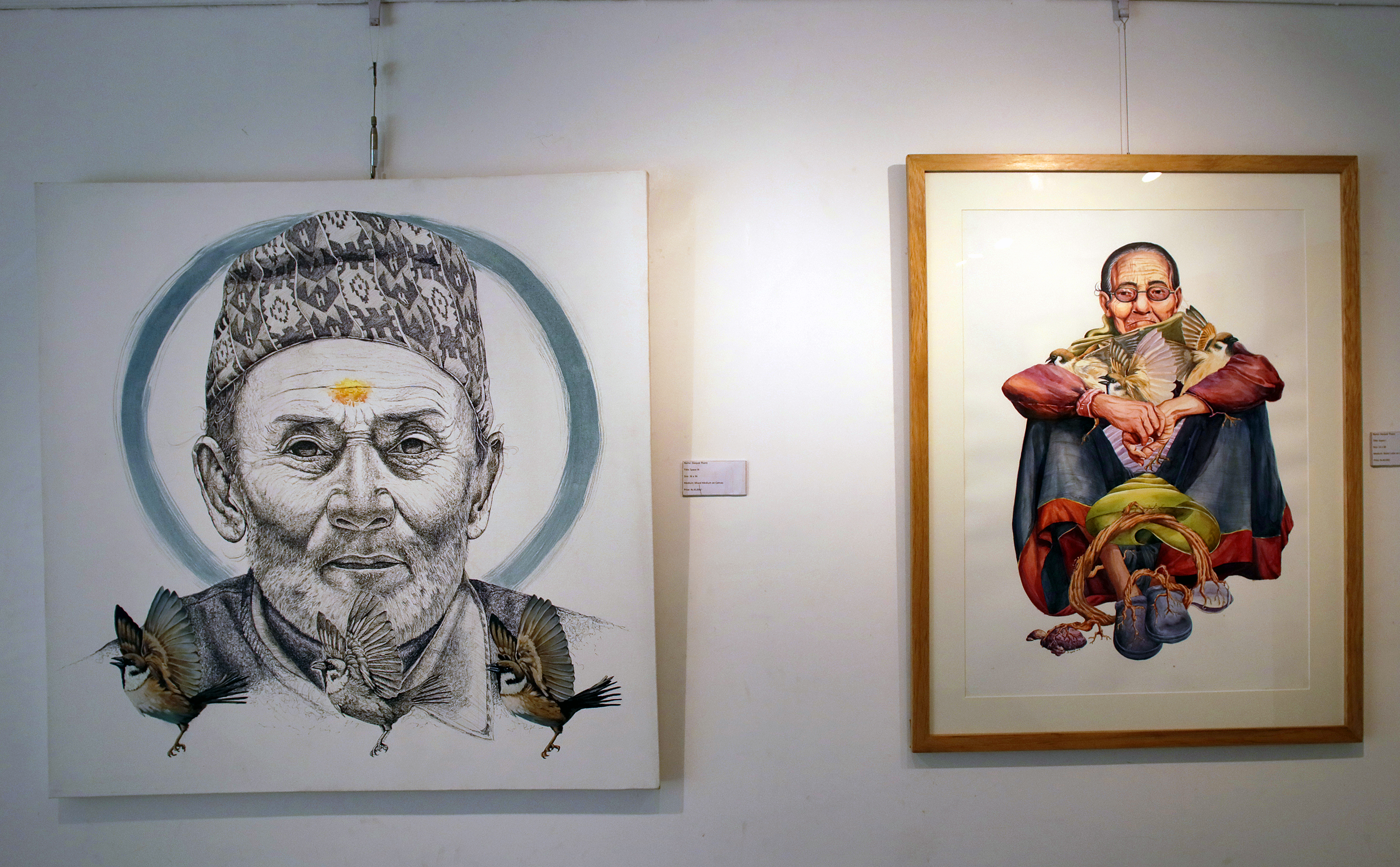 Another artist, Deepak Thami’s artwork feels familiar and novel at the same time—for his paintings are of old people. His elderly characters hold and embrace things forgotten in the hustle of life, such as a lotus and birds. But they also feel like they are wrapped in the worlds they live in—a world uncared for by others. The minute details make the artworks poignant—for instance, the detailed precision on the wrinkles tell of the characters’ age and the stories they have lived.