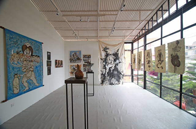 On the gallery’s ground floor, after opening a locked door, one enters a dark room that explores various forms and ideas of nudity. The first installation you see is of Vijay Maharjan, which tells of the beginning of the human world, with Eve biting an apple. His sculpture is headless, and one of its hands is in the form of a snake, while an apple rests above the chest as the snake hisses past it.