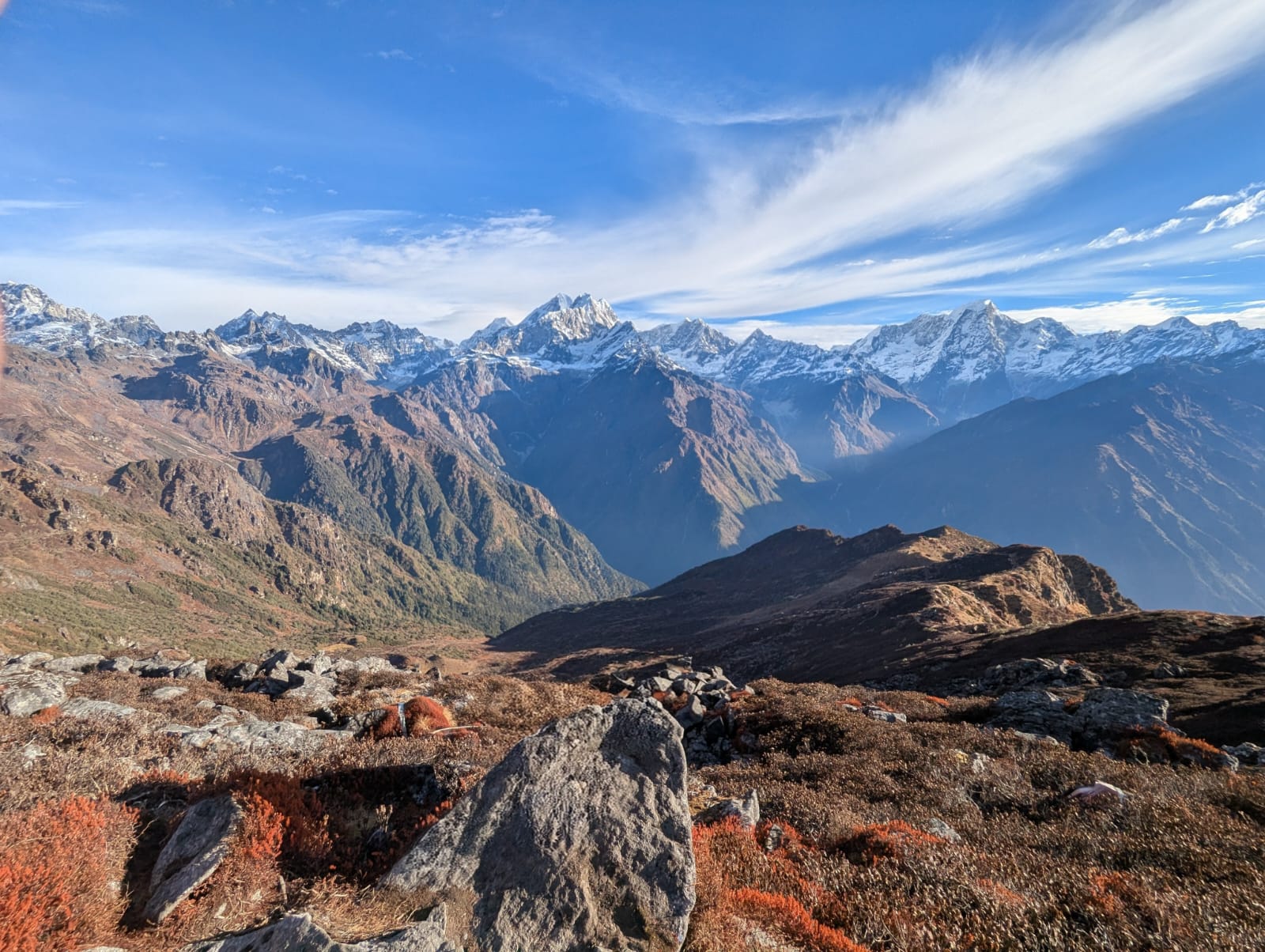 I reached the top just before sunrise. Although clouds blocked the sunrise, the mountains were the true highlight. You get a 360-degree view of the peaks, which makes you forget the exhaustion it took to get there. Locals say that during the monsoon, the hills burst into colour with wildflowers, and that’s why many prefer trekking during that season.