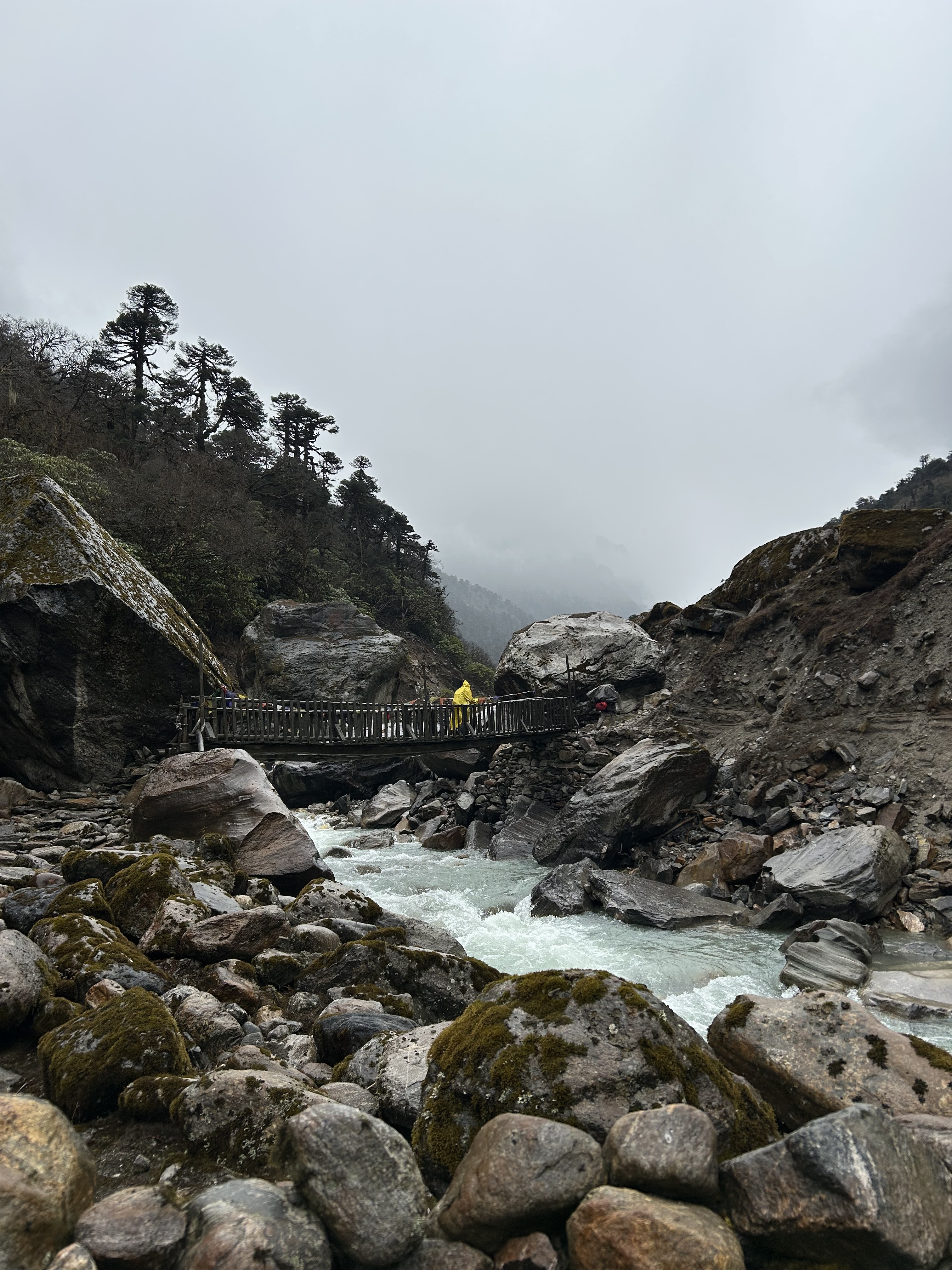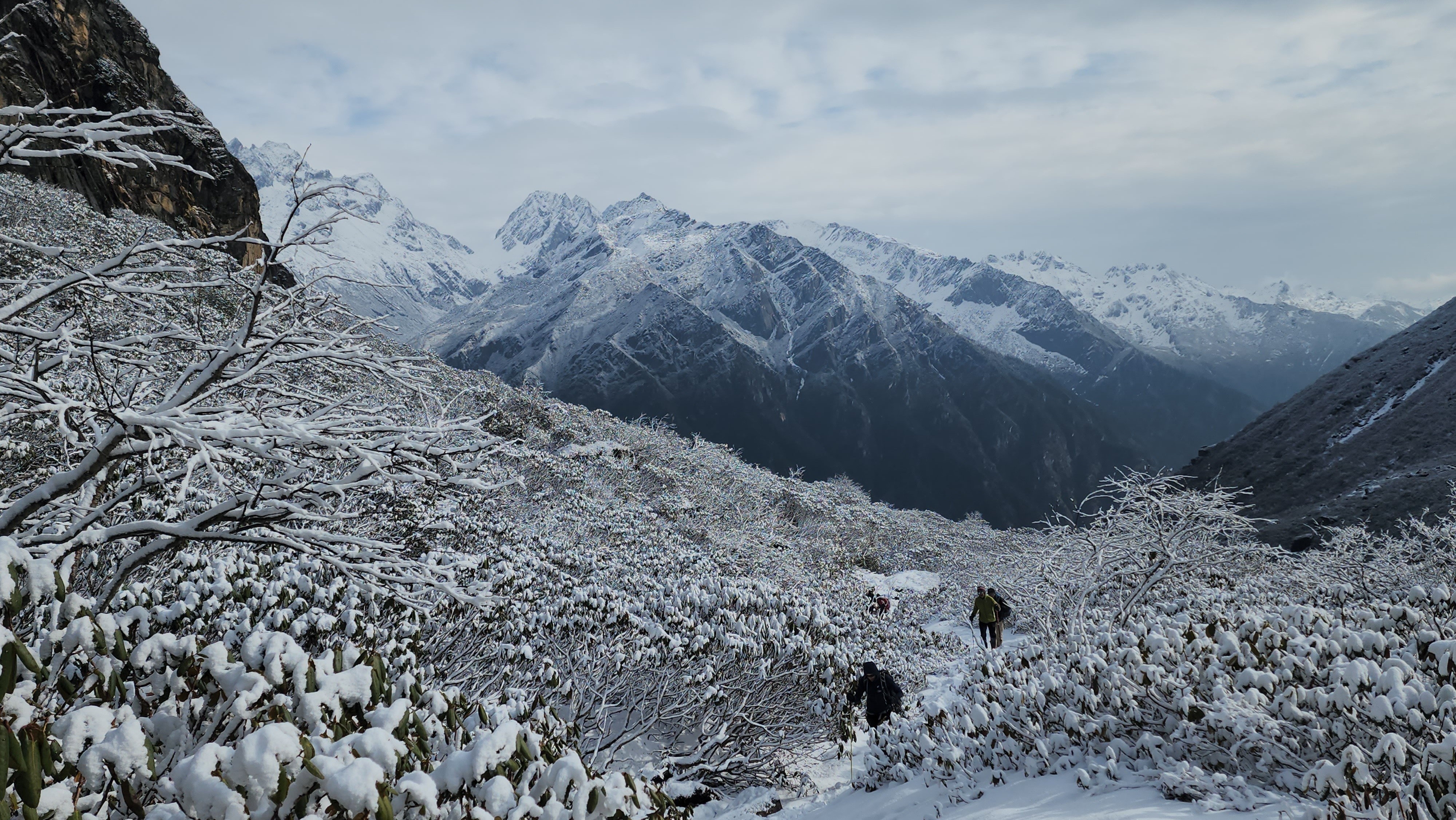 The trail was icy, the air crisp. Because of the rain last night, snow-covered paths were fully shrouded in fog. We learned to expect the unexpected. Shuva, who had begun the journey cautiously due to knee pain, felt his confidence growing. Upon reaching Hotel Shiva View in Khongma Danda—run by Chhiring’s mother—we encountered numerous foreigners, both trekkers and summiteers.