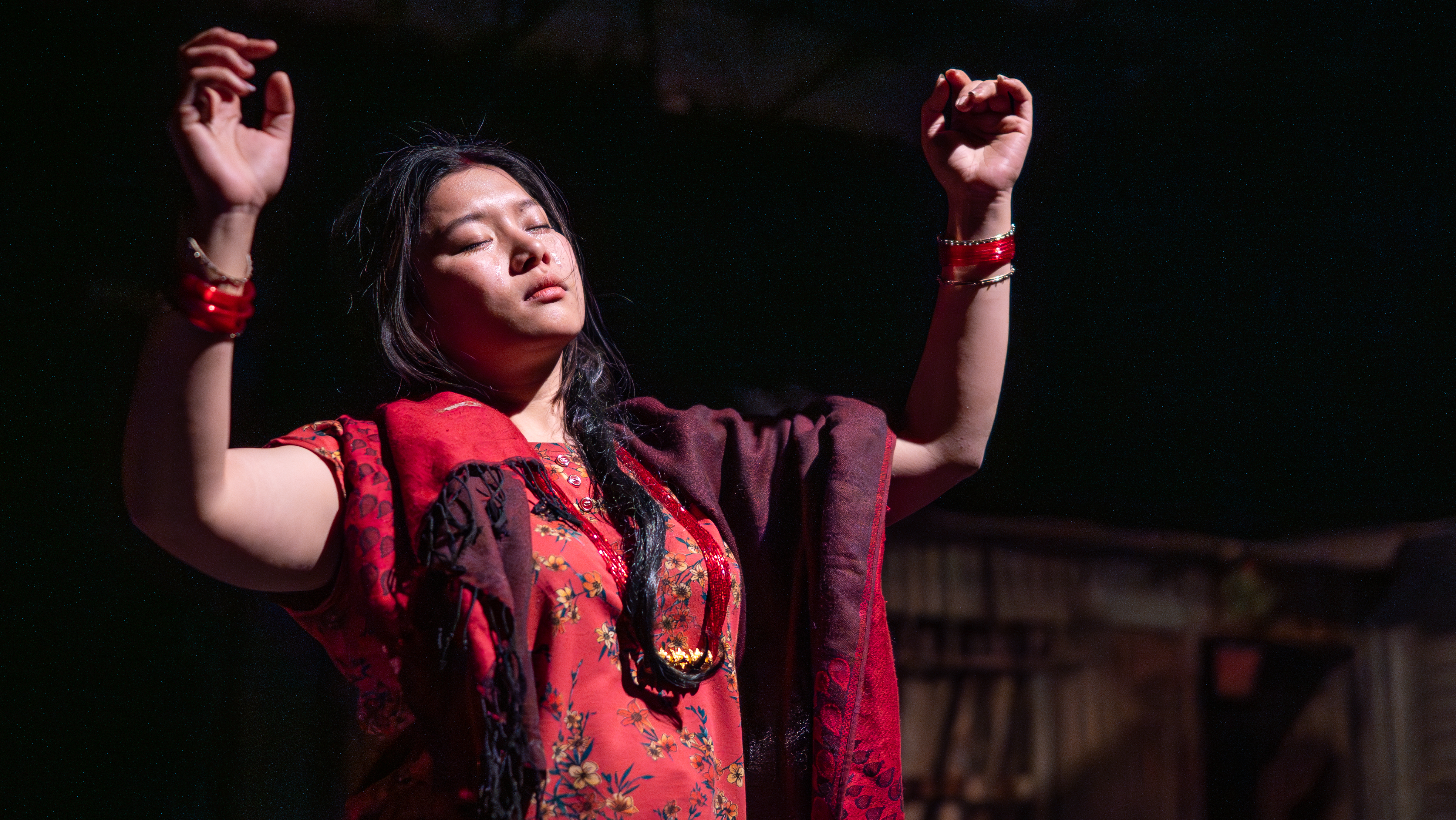 Dhakal masterfully engages the audience through the characters’ dialogue and movement, along with Sabin Bhattrai, the play’s assistant director. While following a crowd of characters can come all at once, Kshitiz Parajuli frolics with the lights, drawing the audience’s focus.