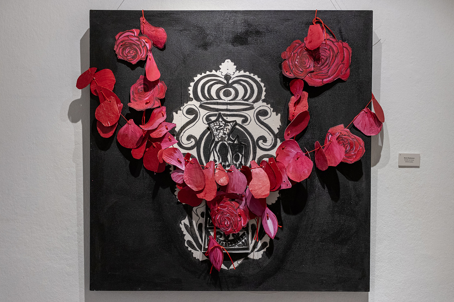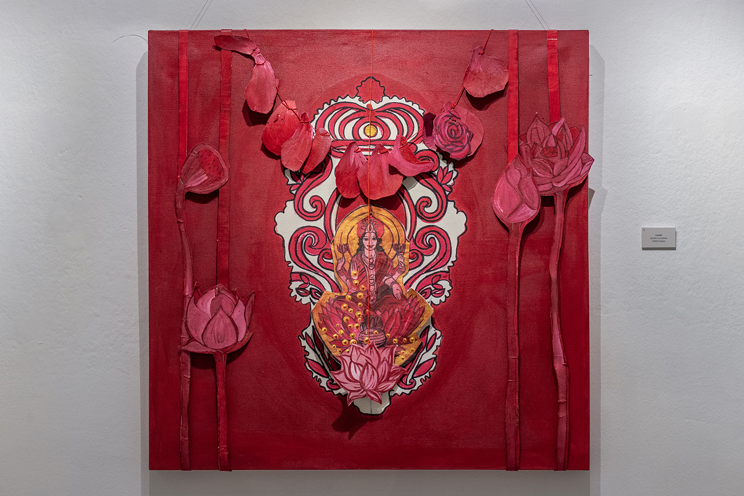 This multiplicity is also reflected in her depictions of Hindu goddesses, like Laxmi and Saraswati. Figures appear not as static icons, but as layered, tactile forms. In ‘Saraswati’, a banner of red rose petals extends outward from the canvas, creating a three-dimensional effect. “I very much like the idea of collage,” Guberti says. “I like the tactile.” The physicality of the material—the cut paper, the layered surfaces—reinforces the sense that these are not distant deities, but presences within reach, beings that can be touched, assembled and reimagined.