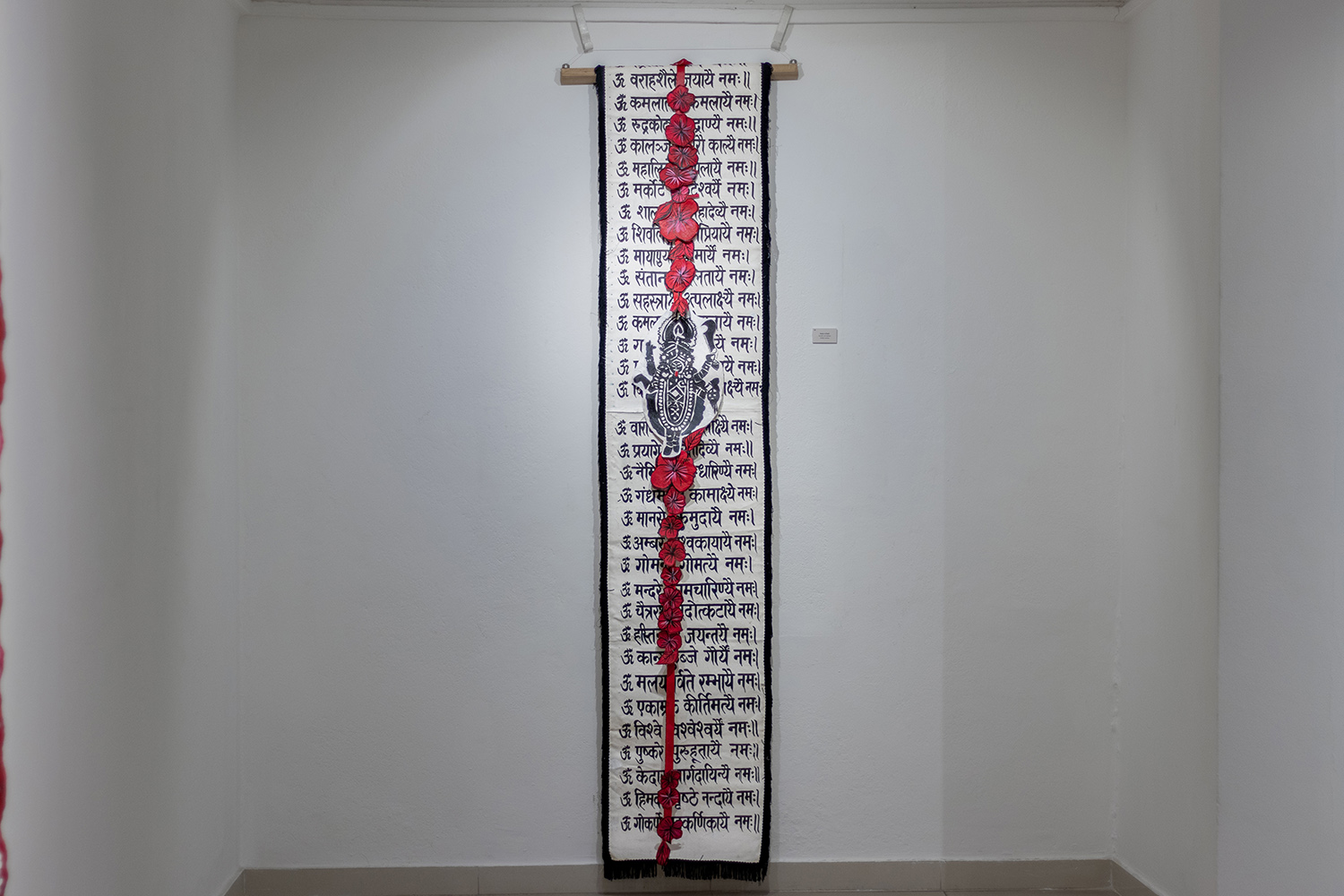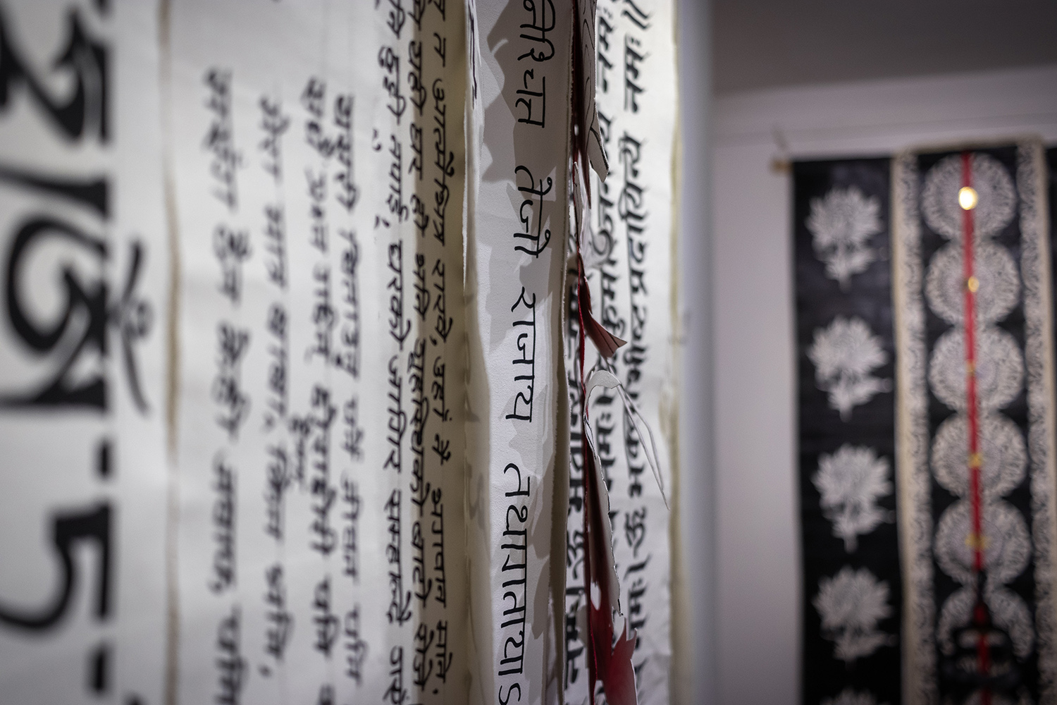 If many of the works inspire introspective and individual reflection, ‘Prayer to the Feminine’ leans into the collective. In this work, strips of canvas hang densely, layered with handwritten texts in multiple languages—Nepali, Sanskrit, Italian and others. Some are carefully inscribed, while others feel urgent, almost spilling across the surface. Standing before it, the effect is overwhelming, as if encountering a flood of voices long held back.