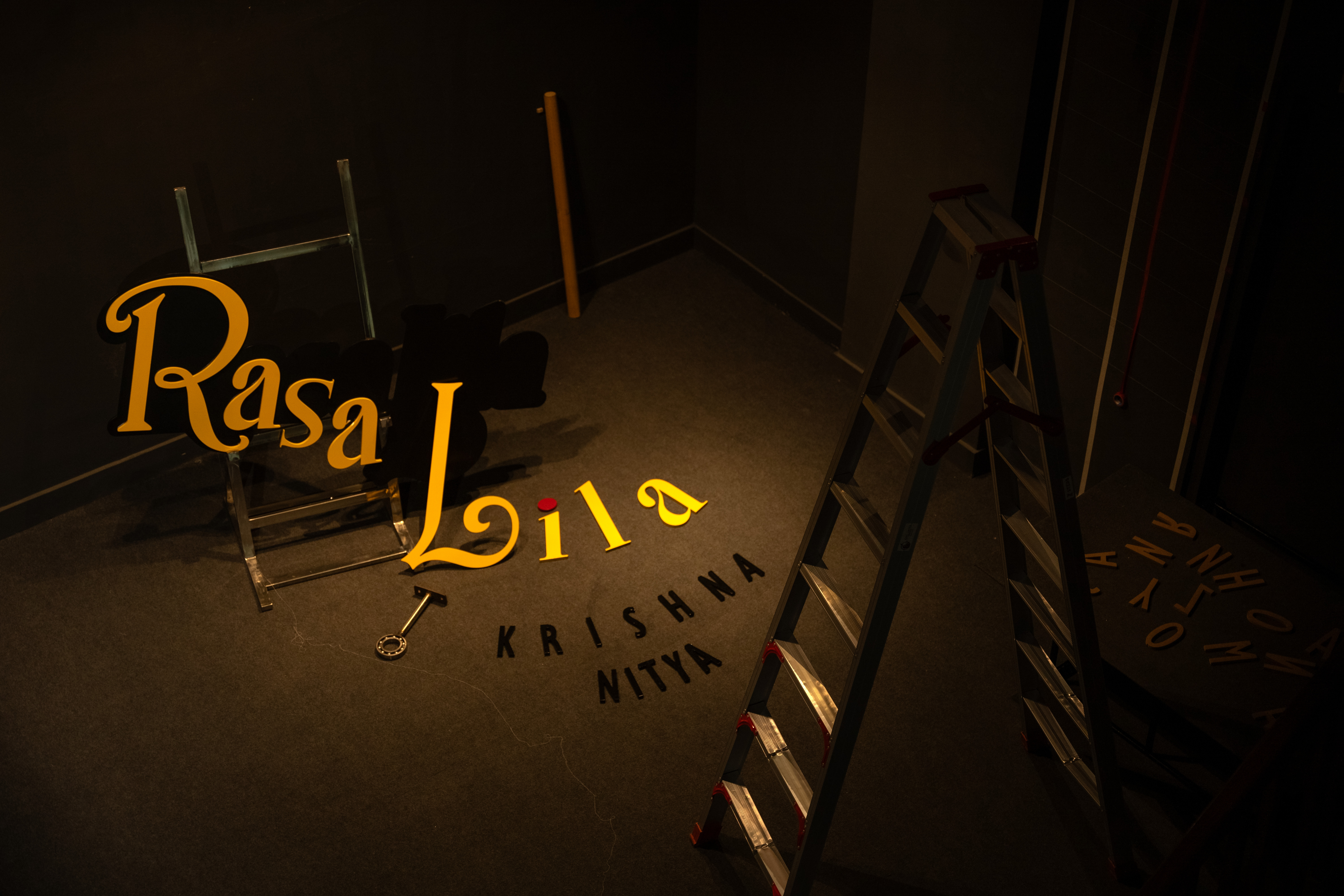 The holy Yamuna river, flowing beside the beautiful Vraja, has symbolic meaning according to the way it is presented in the exhibition. The river is scattered with the jumbled letters of the names of the exhibition's creators, hinting at civilization's ever-flowing nature.