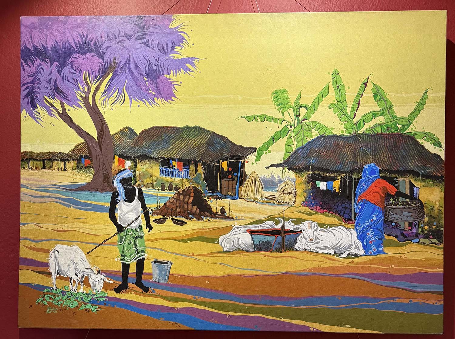 Upon entering the gallery, the viewer is immediately met with Rajan Pant’s complimentary acrylic paintings ‘Terai Village I’, and ‘Terai Village II’. Though they are depictions of Nepali plains, the vibrant colours allow for an exploration of locations and create a sense of imaginary familiarity. It’s as if the figures could be anywhere in the world exploring a whimsical landscape. Pant depicts scenes of movement and liveliness, using figures in motion and the dynamic nature of his objects, sand, sky and trees.