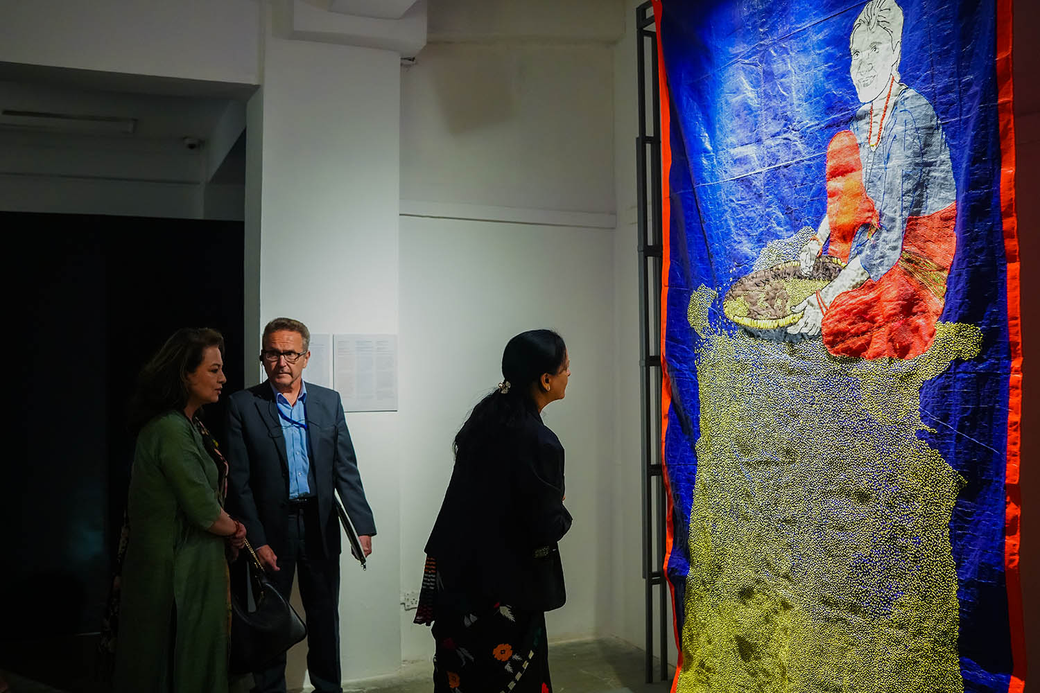 An artwork that commands visual attention with its large, encompassing presence is ‘The Winnower’s Rhythm’. Made entirely from stitching on a tarpaulin (a large sheet of waterproof cloth usually found in Nepali households), with sack and thread collages, the texture is its main component.