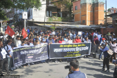 Demonstrators affiliated with youth and student wings of various political parties call for accountability over visit visa scandal.