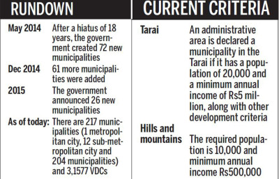 With the formation of a constitutional organ to determine the number and sizes of local bodies in the country, the government has halted its plan to add new municipalities.