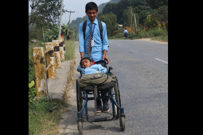 A brother and sister duo make their way to school every morning with the brother helping his sister on the wheelchair.