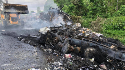 The accident occurred after two trucks collided head-on, causing a fire, early on Saturday.