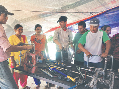 By Weena Pun A group of women sit on a foam mattress in a room surrounded by corrugated iron sheets for walls. The room is a makeshift classroom set up in the fringes of Chautara, Sindhupalchok, to teach these women the skills needed to work as electricians.