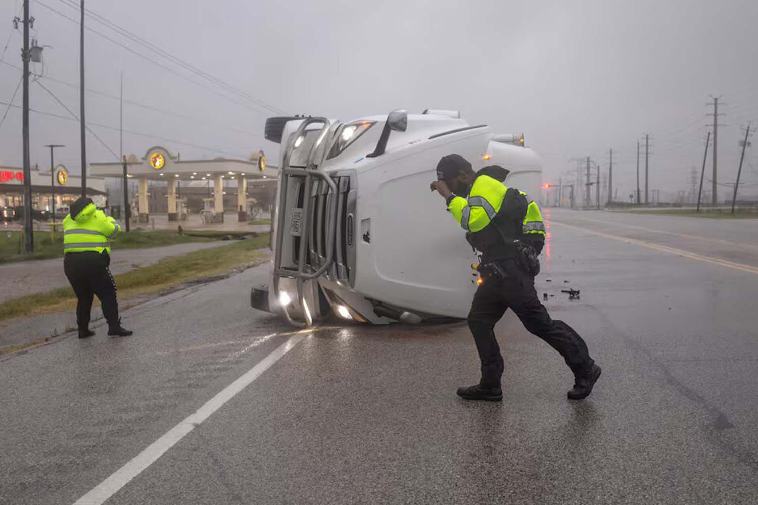Crews using a life jacket and ladder fire truck rescued a man from a truck on a flooded stretch of freeway, video posted on social media by Houston’s local ABC station showed. Patrick said there were several other rescues.