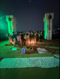 What the procession lacked in numbers—a few dozen marchers at most—was made up by the passion of some youngsters waving the national flag. The crimson-red Double Triangle with its blue borders and white sun and moon stitched to the surface stands out anywhere. It looked even more distinctive when being waved with saffron banners.