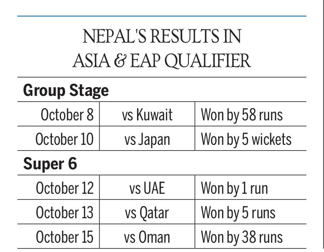 The win over Oman ensured that Nepal stayed unbeaten in the Qualifier, having won six matches—two in the Group Stage and four in the Super 6.