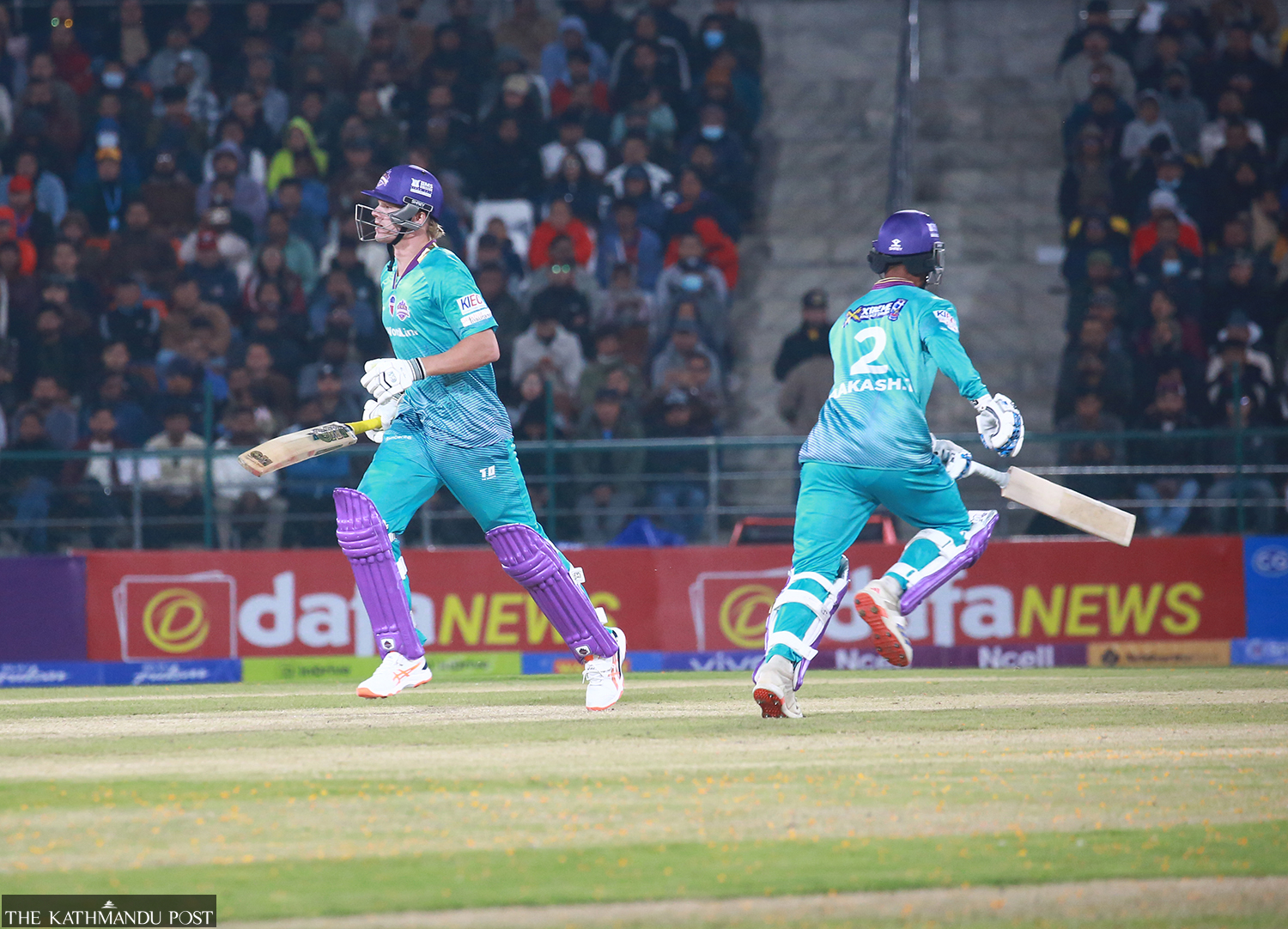 In turn, Kathmandu had a proper start with the bat. By the time Ben Charlseworth left his opening partner Aakash Tripathi in the first ball of the ninth over, the Gorkhas had already scored more than half of the runs they needed. Charlesworth’s departure, after adding 46 off 23 (5 fours, 3 sixes), left Kathmandu comfortable at 70/1.