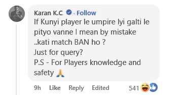 KC, on Saturday morning, commented on a Facebook post by Troll Cricket Nepal. The post was regarding Bagmati’s skipper Sandeep Lamichhane getting disappointed over an umpiring decision during the Men’s PM Cup fixture against Madhesh in Birgunj on Friday.