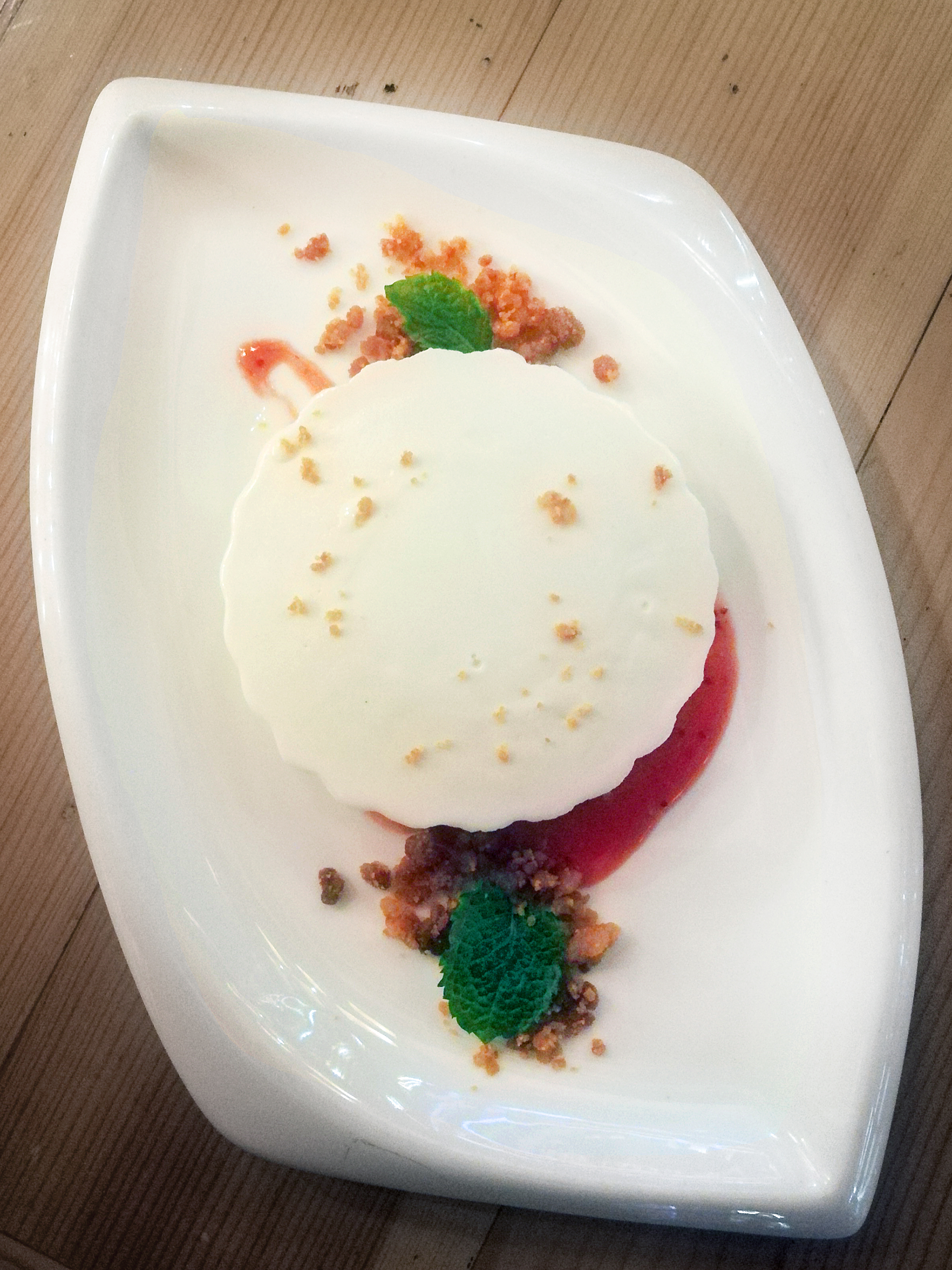 There’s some room for my sweet tooth, so the eyes scan the menu, pausing on panna cotta. Dulcet and chewy crumble and a berry goo are placed around the wobbly dessert. It won’t win any awards for innovation, but the panna cotta tastes akin to melted ice-cream. The Thai connection comes with the use of coconut cream, and it’s pleasant enough to end the meal.