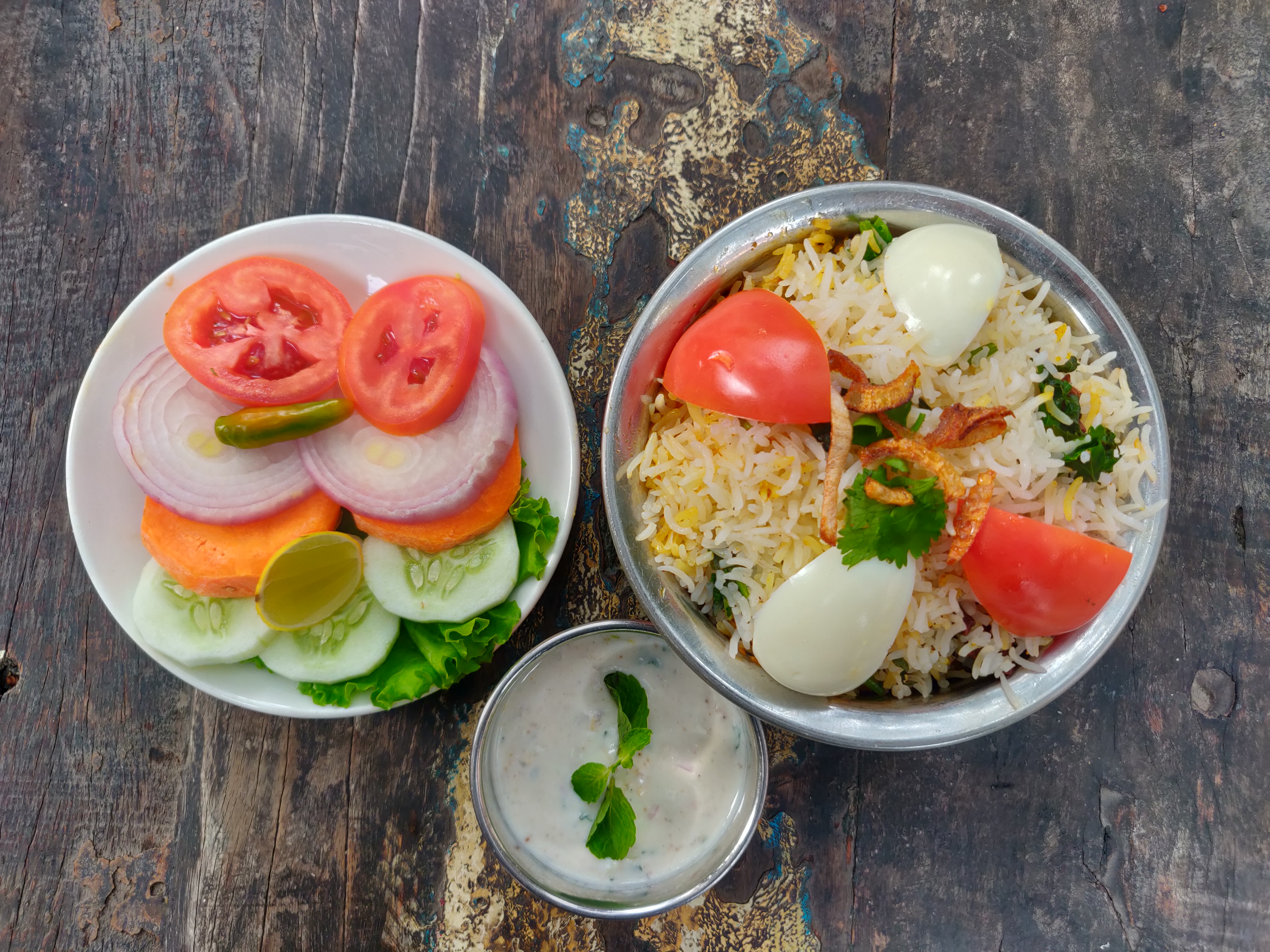 The biryani seems more like curry on rice, but upside down in a bowl. Topped with a quartered tomato and egg, and singed onion, and served with a generous plate of salad, the dish is a meal unto itself. The raita pretends to be cooling, but bites the tongue with the occasional green chilli hit, which is a rather necessary addition for this largely greasy dish. While the boneless dark meat used in the biryani’s bottom is rich and juicy, the entire dish is simply too oily. Digging down and pulling out a cross section of the biryani only reveals one or two layers of colour, and oil pools at the bottom. The end result is a claggy rice dominated by something that seems more like a curry than anything else.