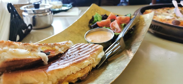 We decide to venture north-west of where our palates had just travelled—to Italy. There are plenty of other culinary destinations, but we decide on a goat cheese and mushroom pizza, along with a panino.