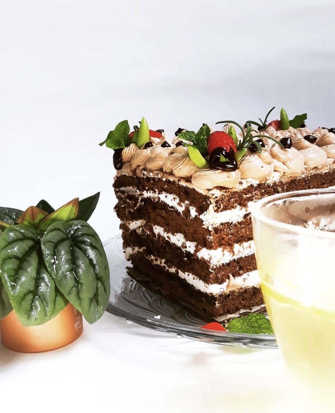 Bake chocolate cake at 175°C (350°F) for 40 mins or until deeply fragrant and springy. Cool, then slice into layers.