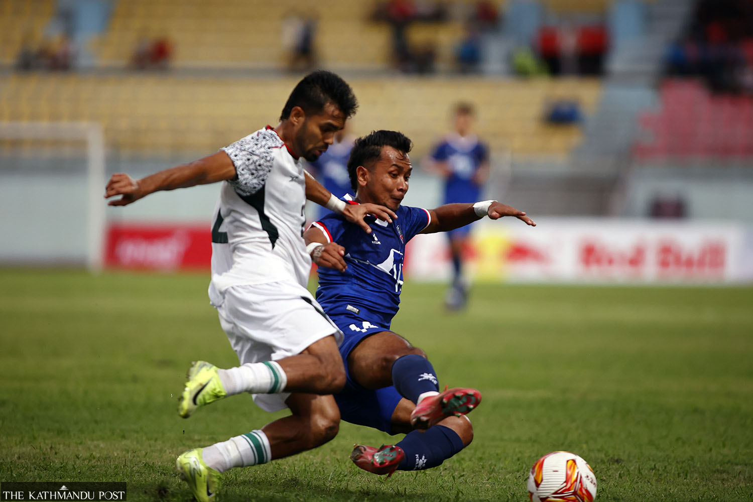 Nepal’s head coach Matt Ross keeps noting down about his players, a scene that recurred during the team’s 0-0 stalemate against Bangladesh on Saturday.Nayak Paudel