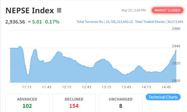 The Nepal Stock Exchange (Nepse) index surged by 5.01 points (0.17 percent) on Monday, the second trading day of the week, closing at 2936.56 points. However, total turnover declined to Rs 15.78 billion from Rs 23.59 billion in the previous session. In the previous session, the benchmark index closed at 2931.55 points.