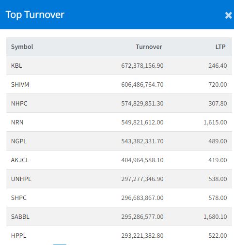 Kumari Bank Limited led turnover with over Rs 670 million, closing at Rs 246.40.