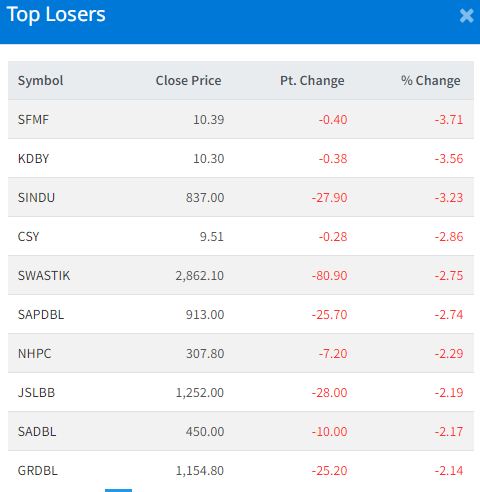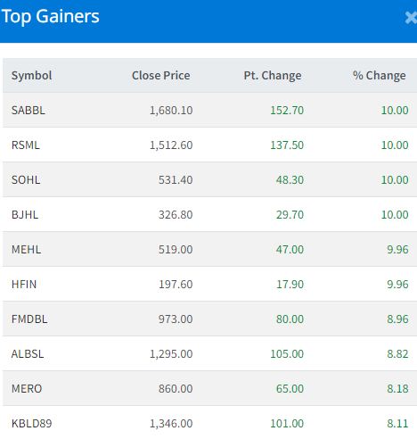 Four stocks—Bhujung Hydropower Limited (BJHL), Reliance Spinning Mills Limited (RSML), Salapa Bikas Bank Limited (SABBL) and Solu Hydropower Limited (SOHL)—hit the upper circuit with gains of 10 percent each. They closed at Rs 326. 80, Rs 1512.60, 1,680.10, and Rs 531.40, respectively.