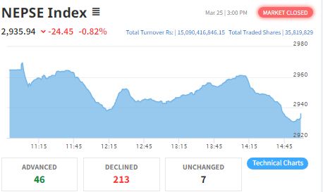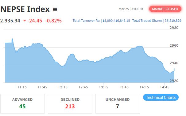 The Nepal Stock Exchange (Nepse) index fell on Wednesday, ending a five-session rally. The benchmark declined by 24.45 points, or 0.82 percent, closing at 2,935.94.