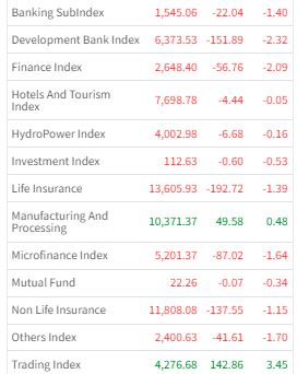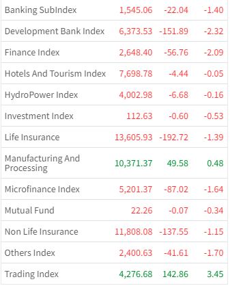 Of the 13 sub-indices, only two ended with gains. The trading sub-index rose the most, gaining 3.45 percent, while the development bank sub-index fell the most, down 2.32 percent.