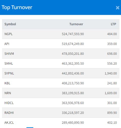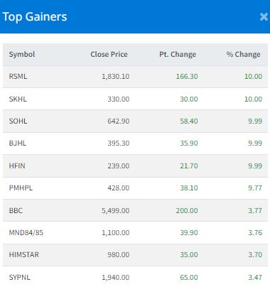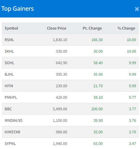 Five stocks—Reliance Spinning Mills Limited (RSML), Super Khudi Hydropower Limited (SKHL), Solu Hydropower Limited (SOHL), Bhujung Hydropower Limited (BJHL) and Hotel Forest Inn Limited (HFIN)—hit the upper circuit. They closed at Rs 1830.10, Rs 330, Rs 642.90, Rs 395.30 and Rs 239, respectively.