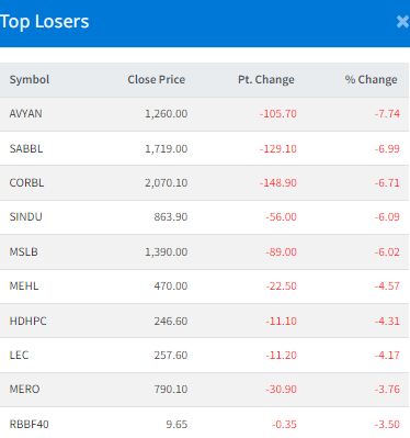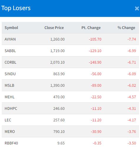 Aviyan Laghubitta Bittiya Sanstha (AVYAN) posted the biggest loss, dropping 7.74 percent to close at Rs 1,260.