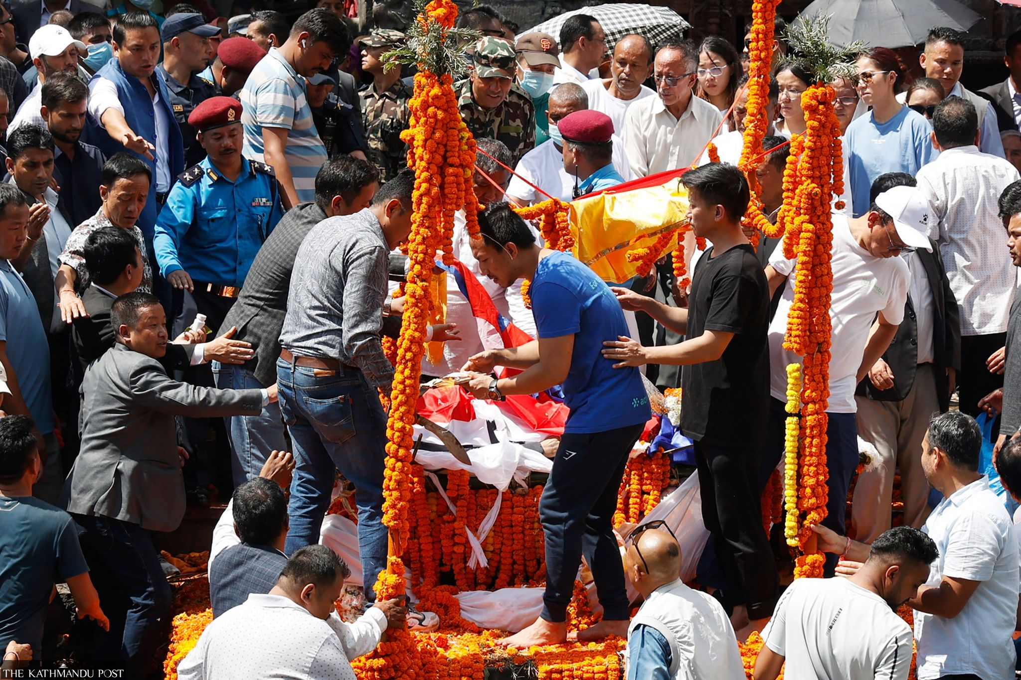 Prime Minister Pushpa Kamal Dahal draped the national flag over the CPN-UML vice-chair Nembang’s body as he paid his final respect to the deceased.