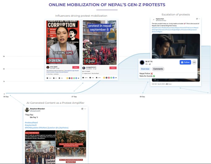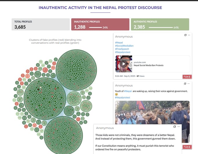 The report, titled “Nepal Protests 2025: Online Narratives and Fake Profile Influence”, examined conversations across X, Facebook, and TikTok between September 6 and 9. (The Gen Z uprising took place on September 8 and 9.)