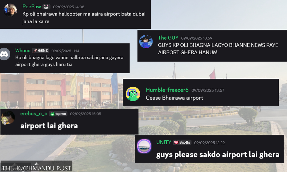 On September 9 at 9:21 am, “Bishwas Thapa” said: “Keep an eye on the airport. Don’t let anyone escape.” Zeus added, “KP is fleeing,” and others urged, “Block the airport.” At 10:40am, PLUTO tagged all members and wrote: “Tell everyone to get to the airport as quickly as possible.”