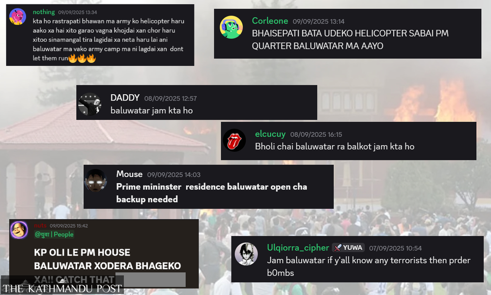 Discord messages show that on the morning of September 9, users were preparing to target Sheetal Niwas, the presidential residence. At 10:53 am, Shree 3 Jung Bahadur Kunwar Ranaji wrote: “Everyone, Ministerial Quarters Pulchok, PM residence Baluwatar, President’s residence Sheetal Niwas.” Other users responded in agreement.