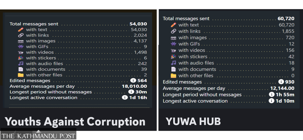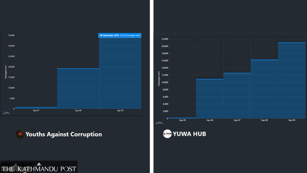 The Post analysed 54,061 messages from the Youth Against Corruption (Hami Nepal) Discord server and roughly 60,000 messages from Yuwa Hub. According to the analysis, between 9:35 pm on September 7 and midnight on September 9, the servers logged about 114,000 messages over roughly 50 hours.