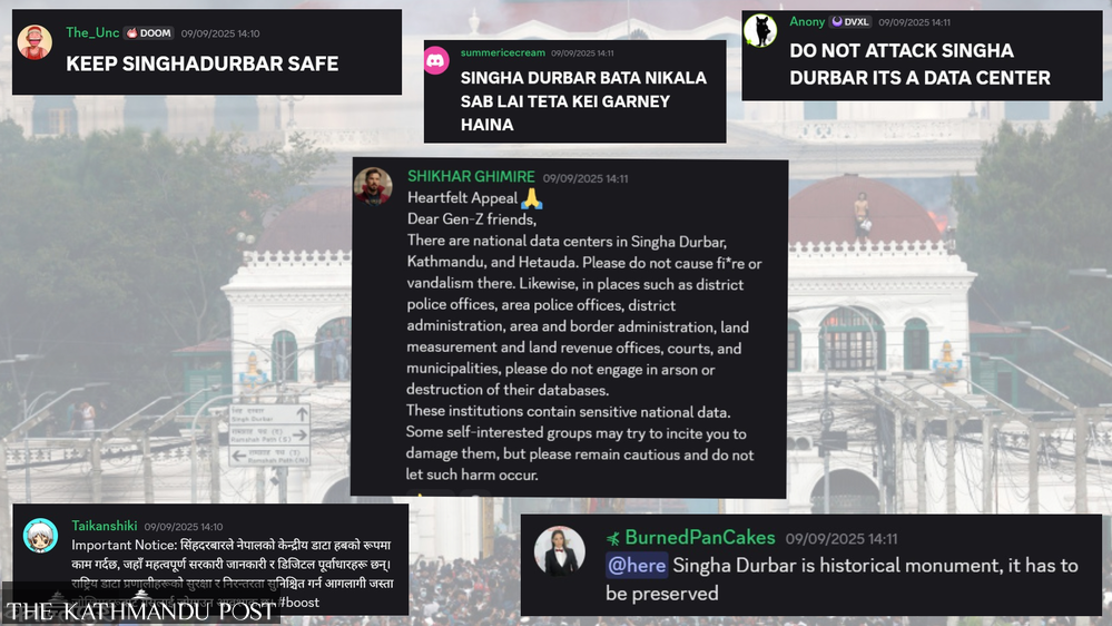 At 2:01pm, user Sam wrote: “Let’s not burn Singha Durbar.” Video metadata obtained by the Post shows the main western gate was already on fire by 2:05pm. Following messages on Discord then centred on saving the building.
