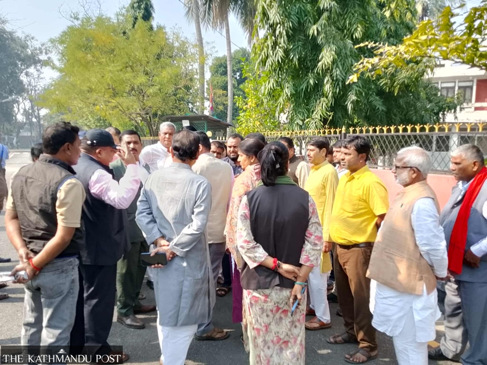 As news spread that the newly appointed chief minister was heading to the office of the provincial government, lawmakers and cadres of the seven parties gathered outside the gate, chanting slogans and burning tyres. Security personnel were heavily deployed around the building as the number of protesters continued to grow.