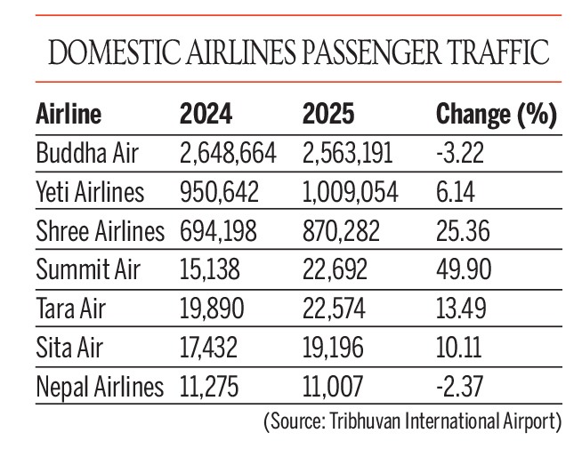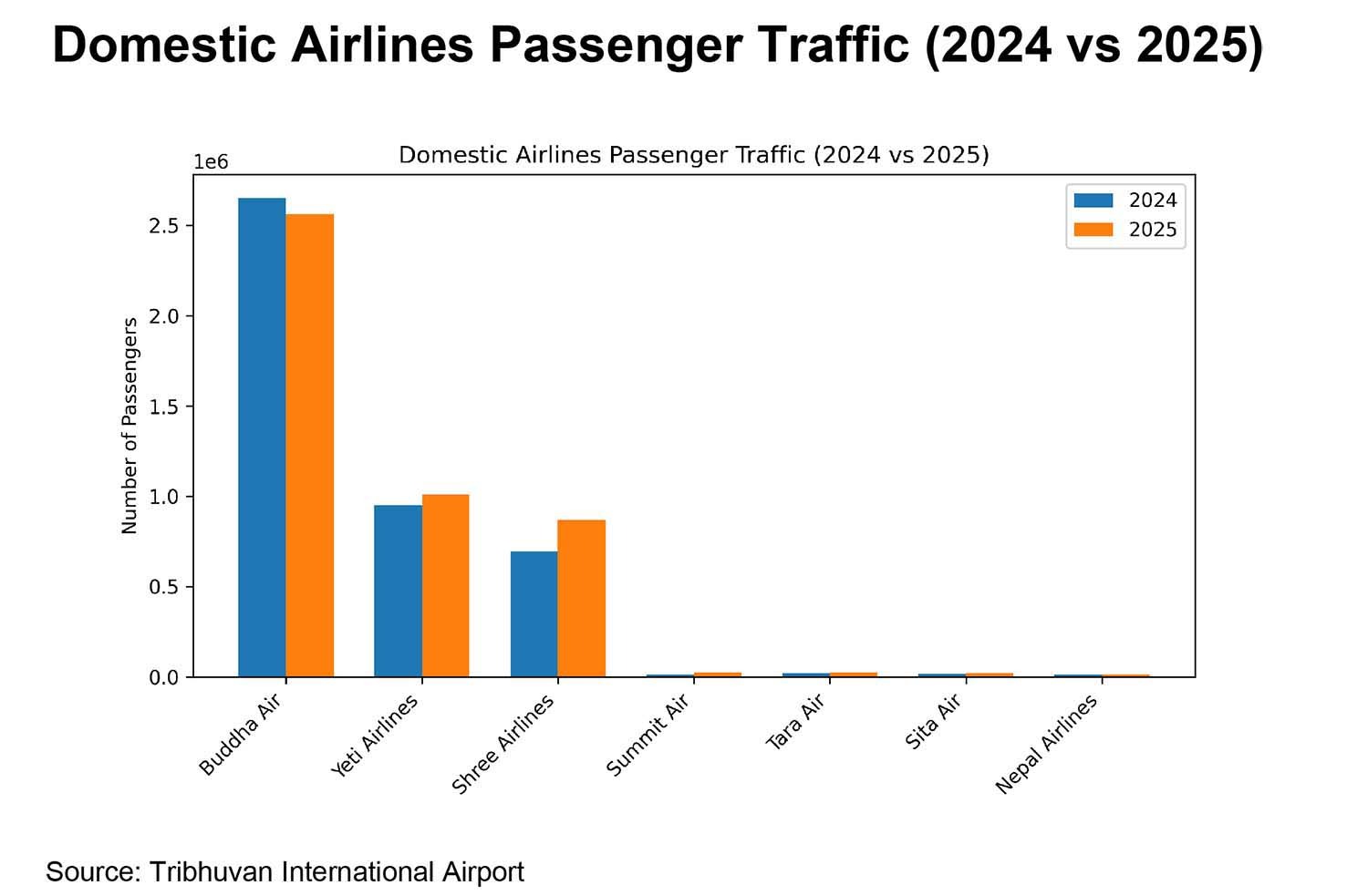 According to Tribhuvan International Airport (TIA) statistics, domestic airlines carried only 98,613 additional passengers in 2025 compared to the previous year.