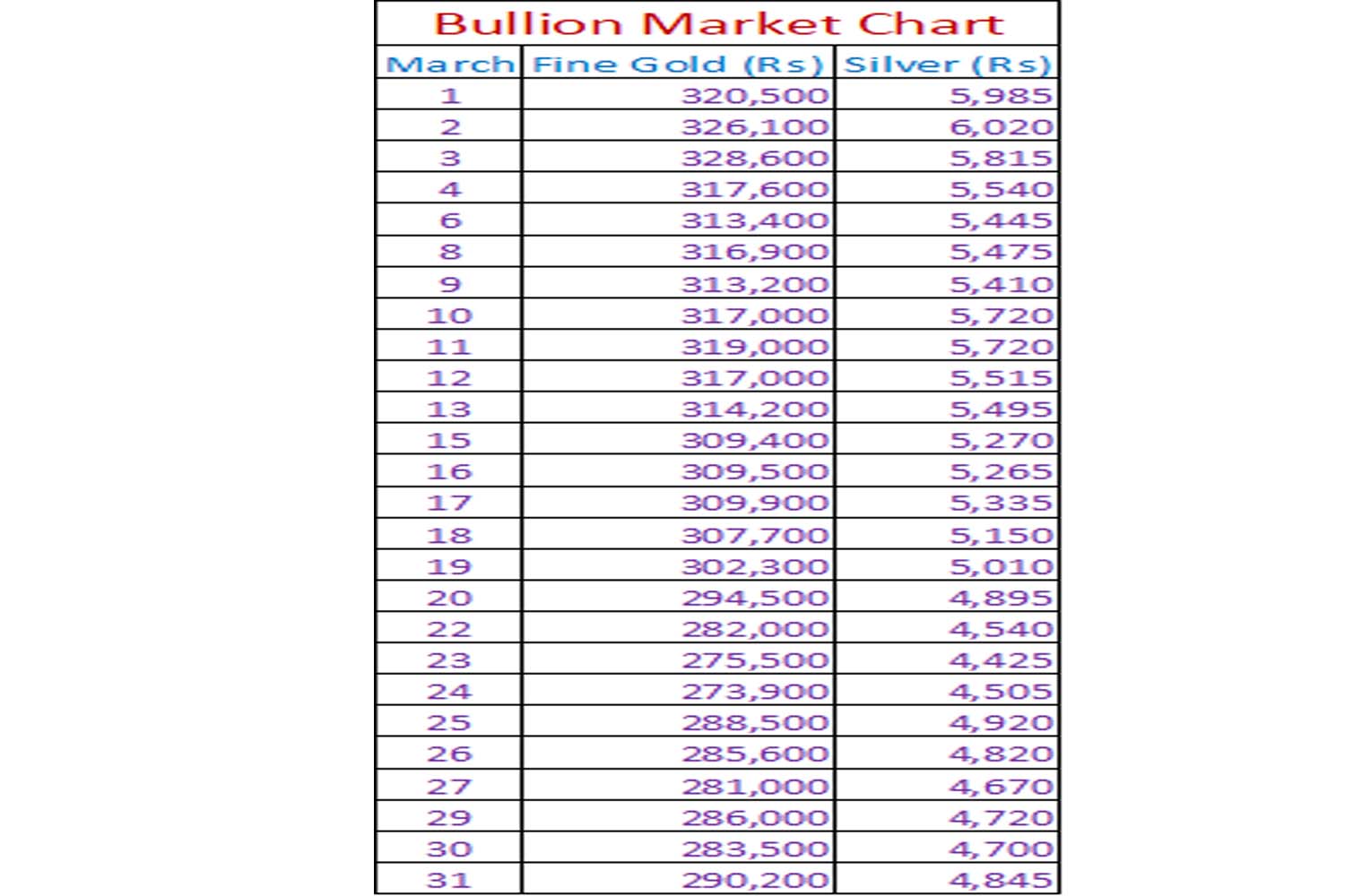 • Peak gold price: Rs 328,600 (March 3)