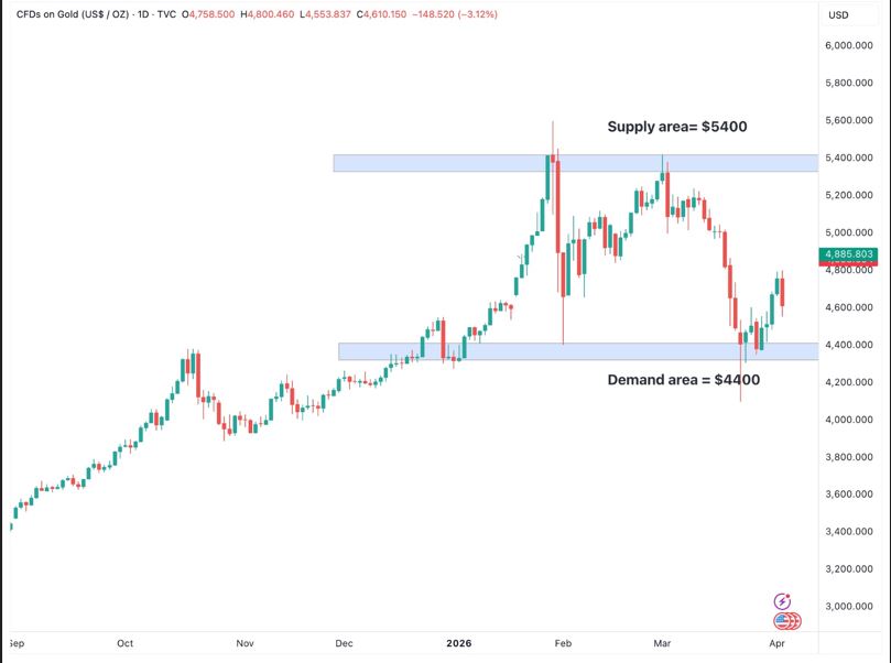 The resistance level is seen at $5400 per ounce, equivalent to roughly Rs 300,793 per tola in the local market. This indicates that when the price reaches the resistance level, selling pressure often increases, making it difficult for the price to go higher.
