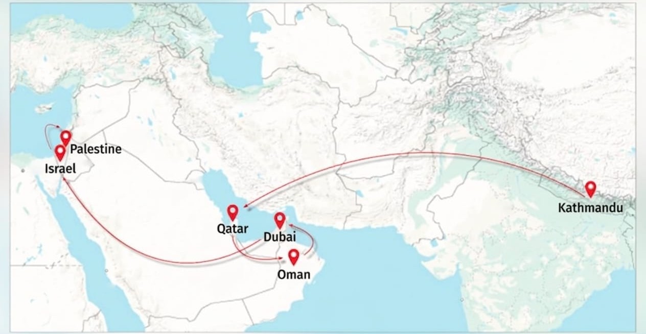 “We were a group of 32 until we reached Oman. From Kathmandu, we travelled through Qatar, Oman and Dubai before reaching Israel,” the woman said over the phone. “But from Oman they sent us to Palestine one by one.”