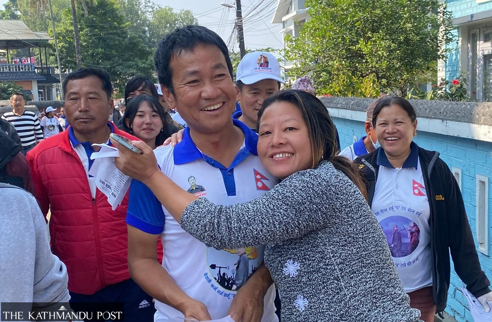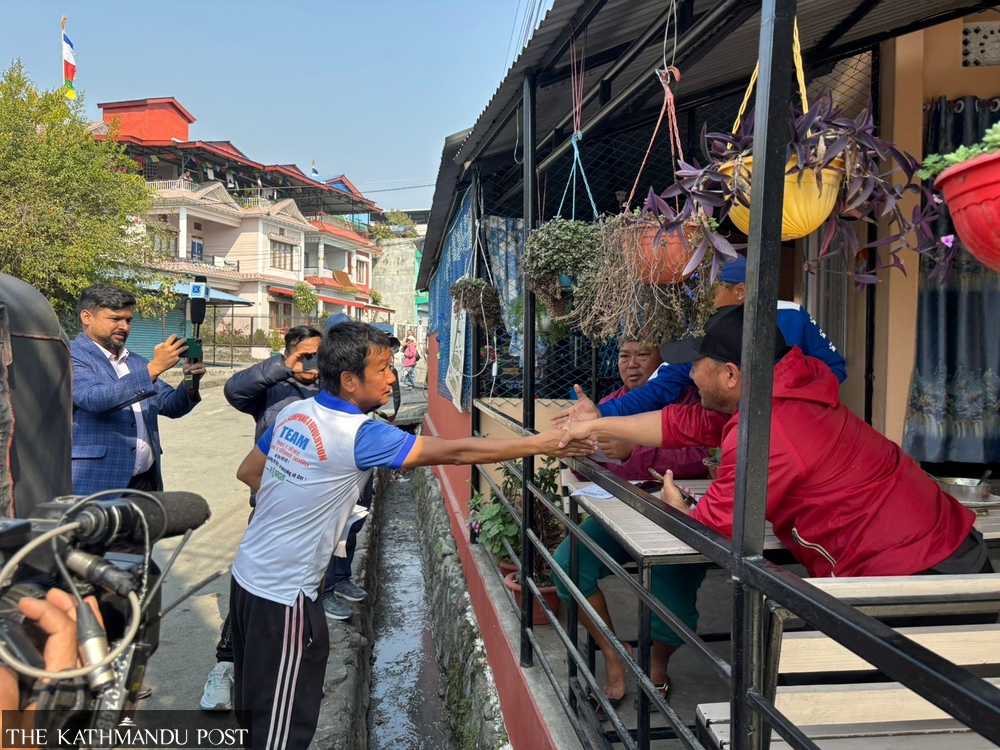 At a home in Pashupati Chowk, 49-year-old Amar Gurung greets Sampang and accepts campaign materials. Gurung says no other candidate has visited him. “He has done good work. He will win here,” said Gurung, citing that he solved the city’s water crisis.