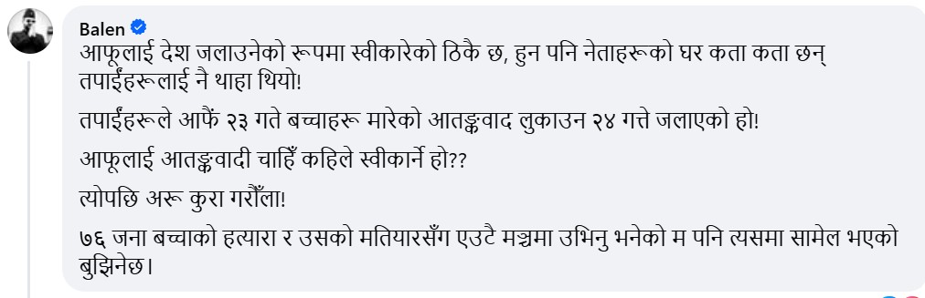 In response, Balen wrote, “It is fine if he considers himself someone who destroys the country. After all, you knew the exact locations of leaders’ houses. On September 8, children were killed to hide terrorism, and the next day, fires were set. When will he admit to being a terrorist? Only then can we discuss other things. Standing on the same stage with the killer of 76 children and his accomplices would make it seem as if I am also complicit.”