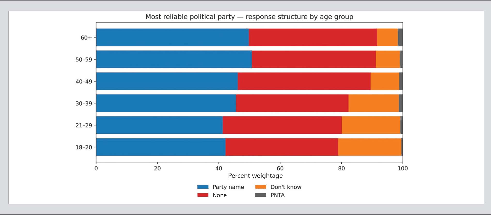 Demographically, these responses are not evenly distributed. The clearest difference appears along gender lines. Among women, 20.8 percent said “don’t know”, compared to just 6.2 percent of men. Similarly, 42.8 percent of women said “none”, higher than the 36.2 percent of men. This combination indicates comparatively higher levels of both uncertainty and rejection among women regarding a “trustworthy party”, shedding light on patterns of political engagement and confidence.