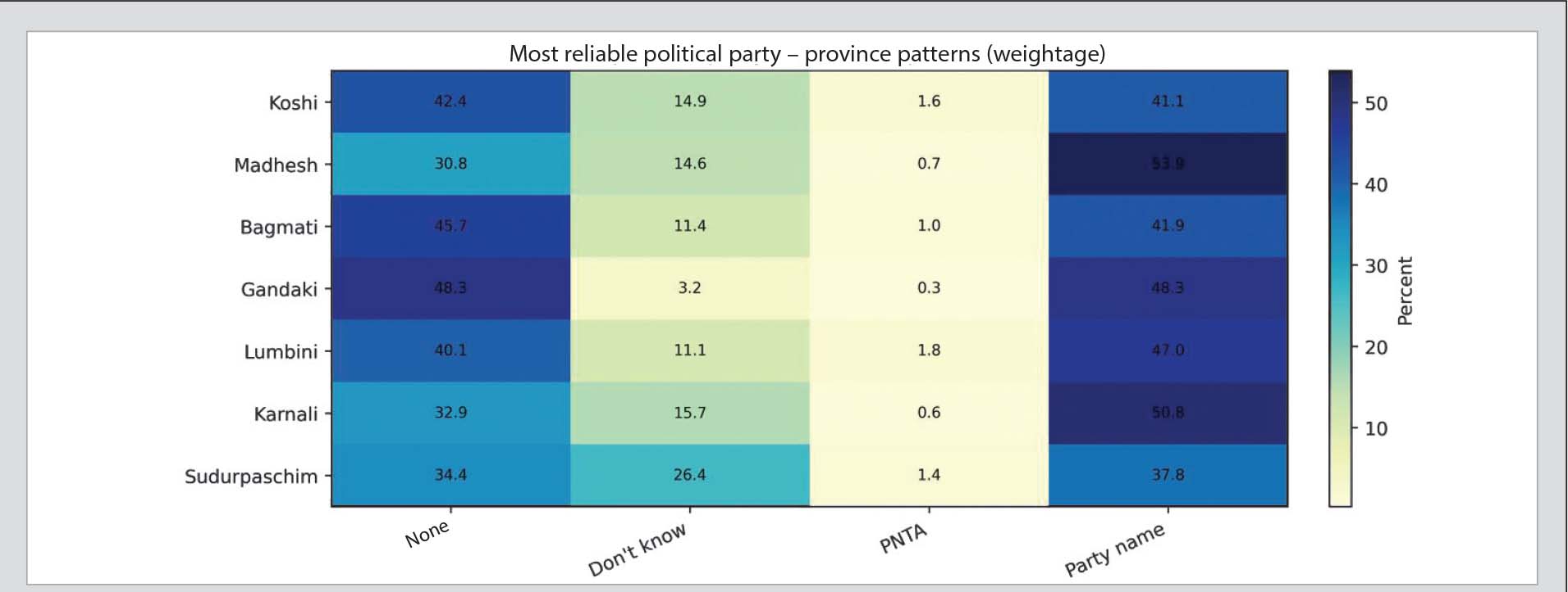 “Don’t know” may reflect indecision, uncertainty, or difficulty in answering immediately. “None” more directly signals a lack of primary trust in any party. For example, the higher share of “don’t know” in Sudurpaschim and the higher share of “none” in Gandaki represent two distinct patterns that should not be interpreted in the same way.
