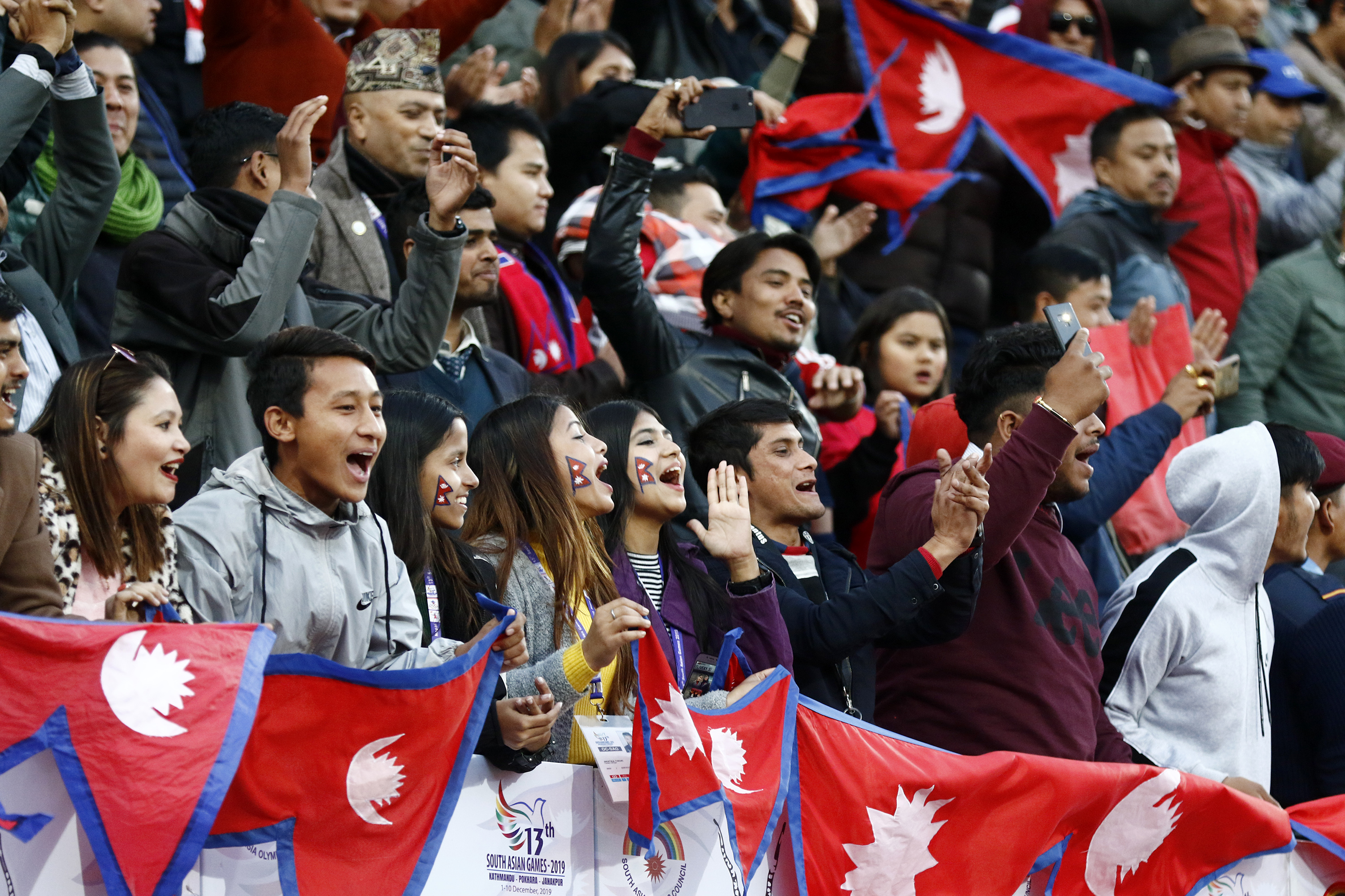 Nepali fans during the South Asian Games men’s football final match between Nepal and Bhutan at the Dashrath Stadium on Tuesday. Kiran Panday/TKP ![]()