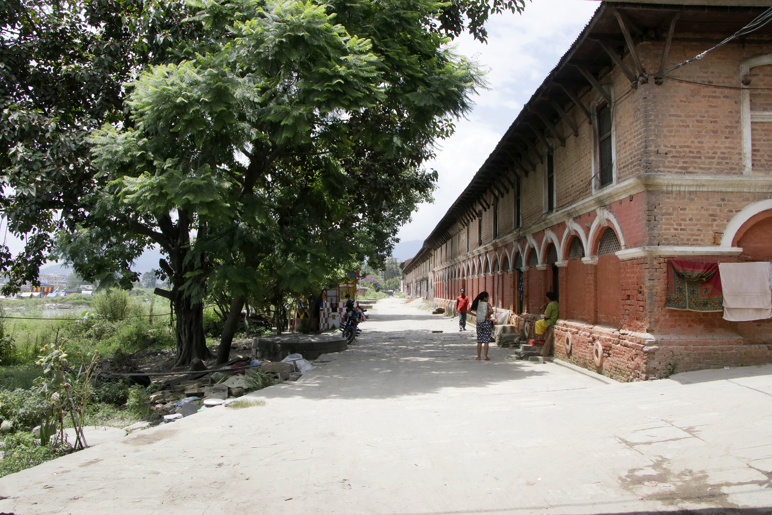 The steps from the bridge that should have led down to Bagmati now meets bushes. The bank of the river marked by the well-like circular cobbled stone structures, used for cremation and bathing purposes in the old days, is now shrouded by bushes, while Bagmati's basin is visible as it dries. On this land, clothes hang on wires, with slum squatters and new temples peppering the border. Some of the stone structures now bear the weights of the big black water tanks.